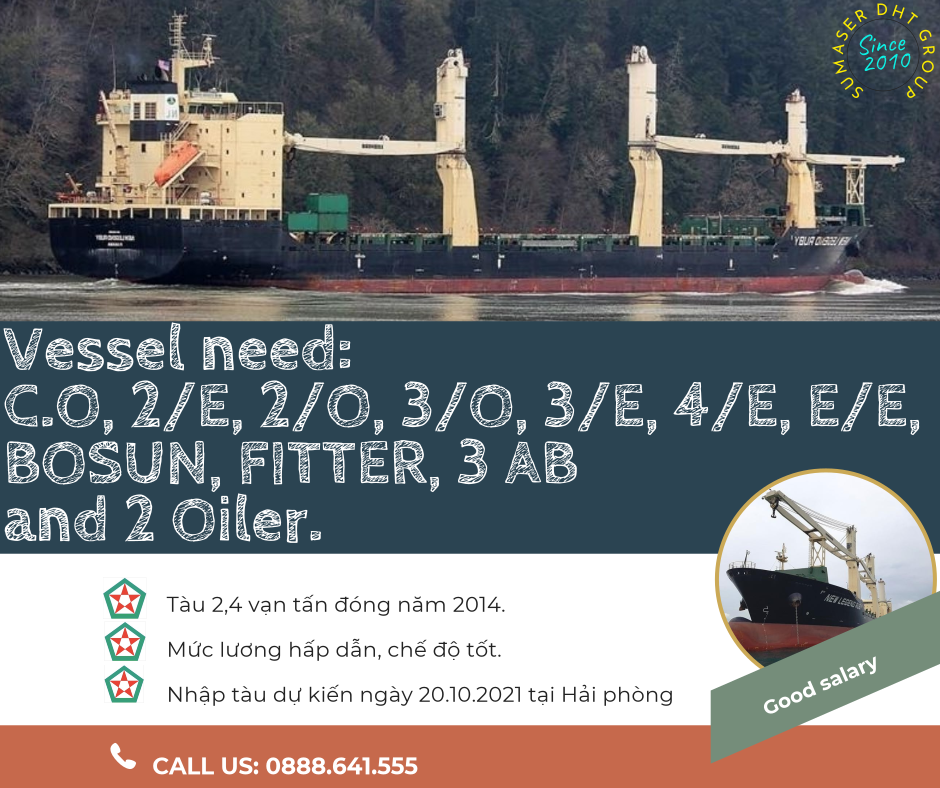 Công ty cổ phần  SUMASER - DHT cần tuyển gấp Đại phó, Phó 2, Phó 3, Máy 2, Máy 3, Máy 4, Sỹ quan điện, Bosun, Fitter, 3AB và 2 Oiler OSD, OSE cho tàu hàng 2,4 vạn đóng năm 2014 với mức lương cụ hấp dẫn.